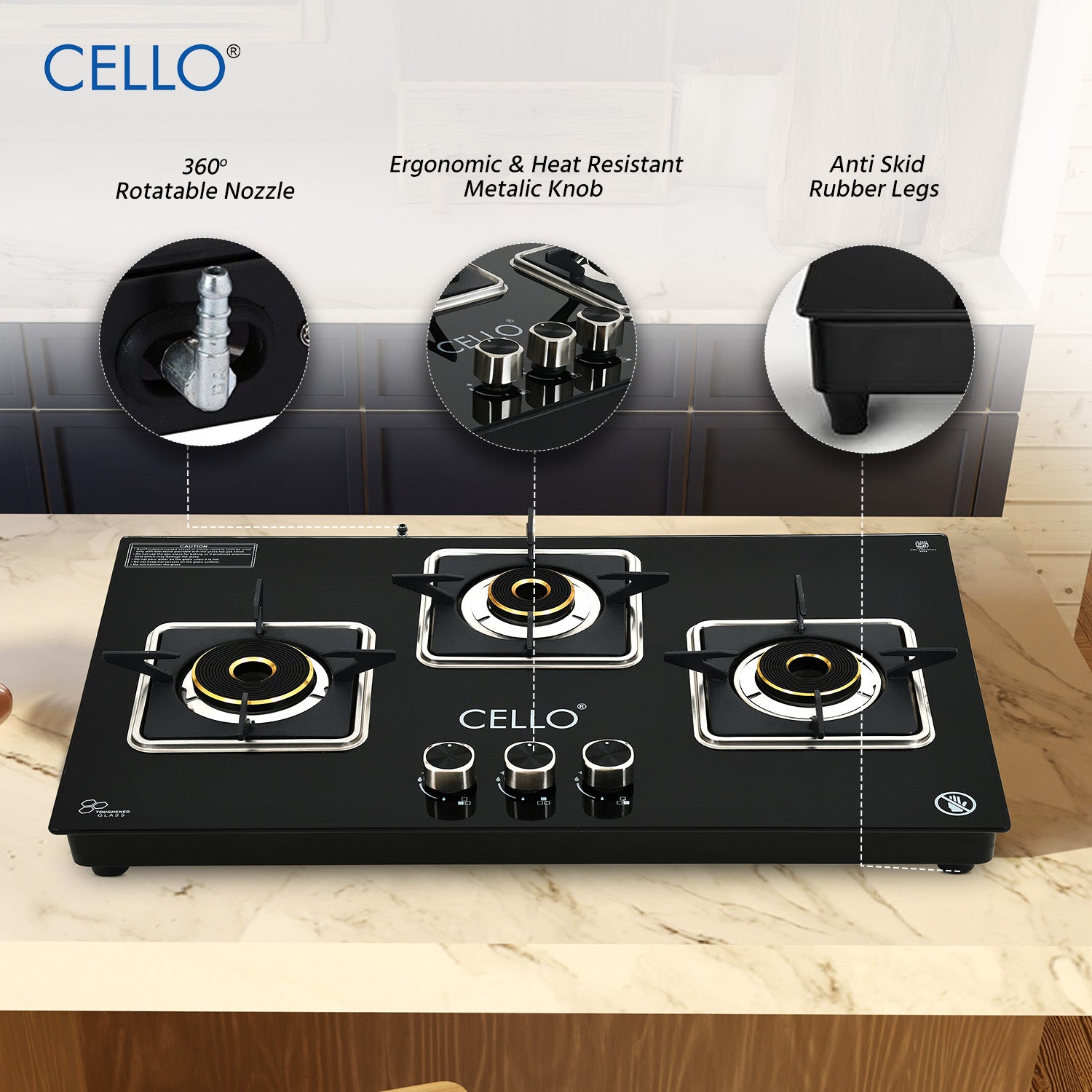 CELLO Platinum Automatic 3 Burners LPG Hob Top - Efficient & Stylish Cooking Solution